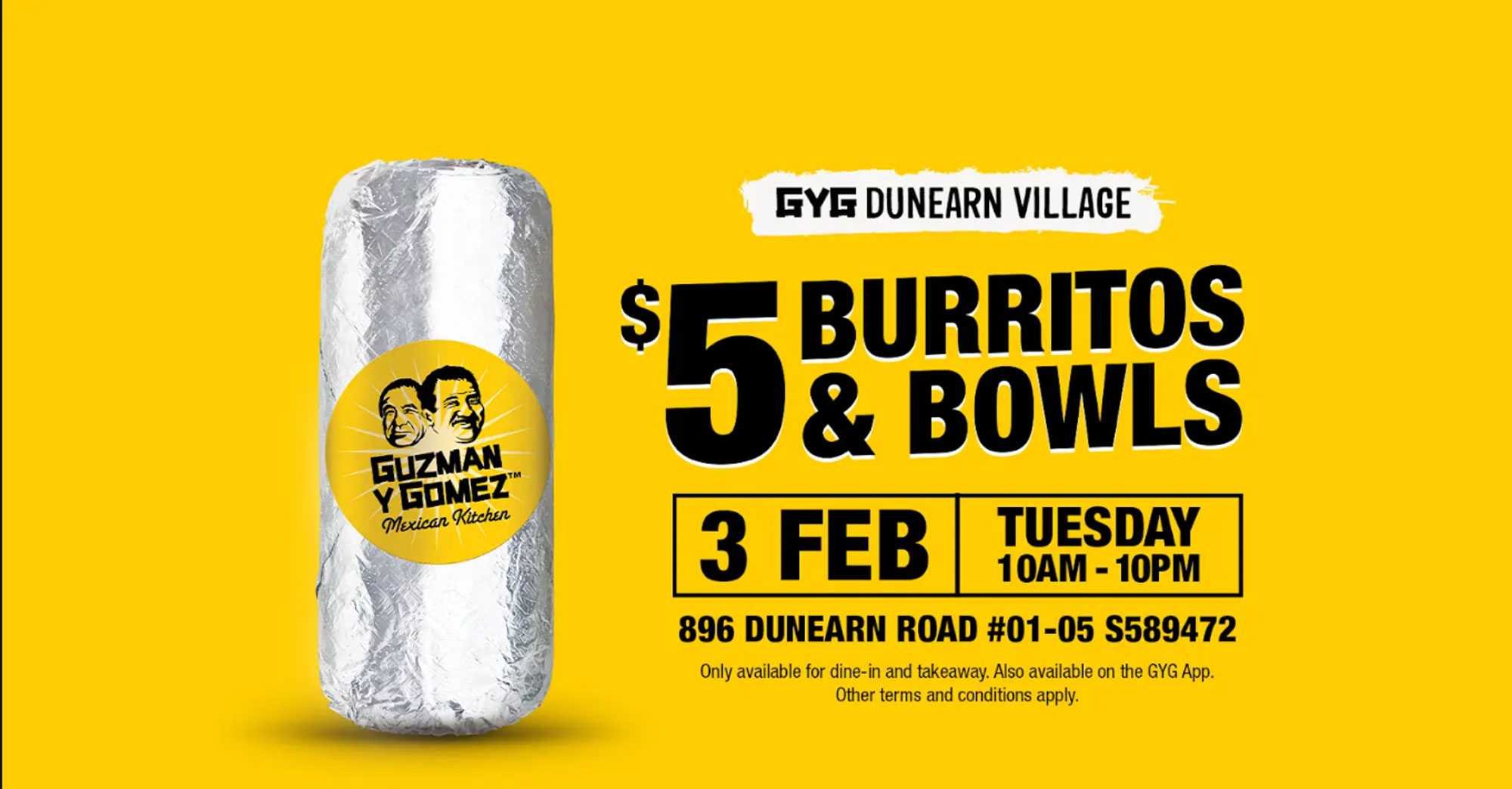 WHAT: $5 Burritos and Bowls (Opening Special – Available for Dine-in and Takeaway. Also available on the GYG App.)